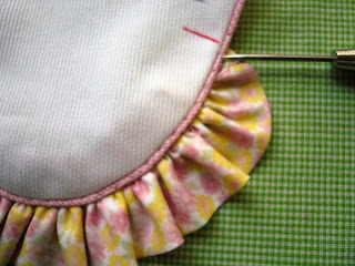 8.  Machine baste (5.0L) right along the piping, holding the gathered ruffle in its finished position.  Be sure the ruffle begins and ends at the marked center front and center back SEAMLINES.